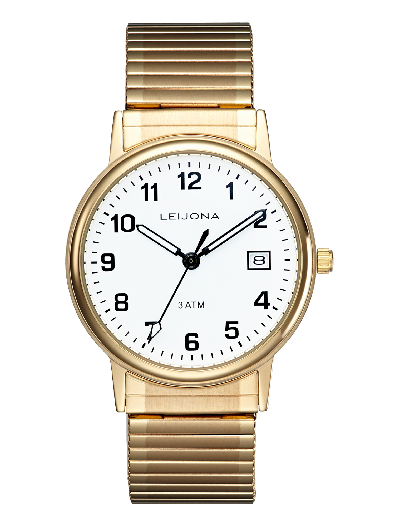 Reilu ja roteva kello ottaa tilansa ja istuu mukavan letkeästi ranteeseen. Jämerät yksityiskohdat rytmittävät kellotaulua ja ranneke jatkaa rungon salskeaa ilmettä. Kullanvärinen kuori ja valkoisena hohtava kellotaulu luovat näyttävän yhdistelmän!
