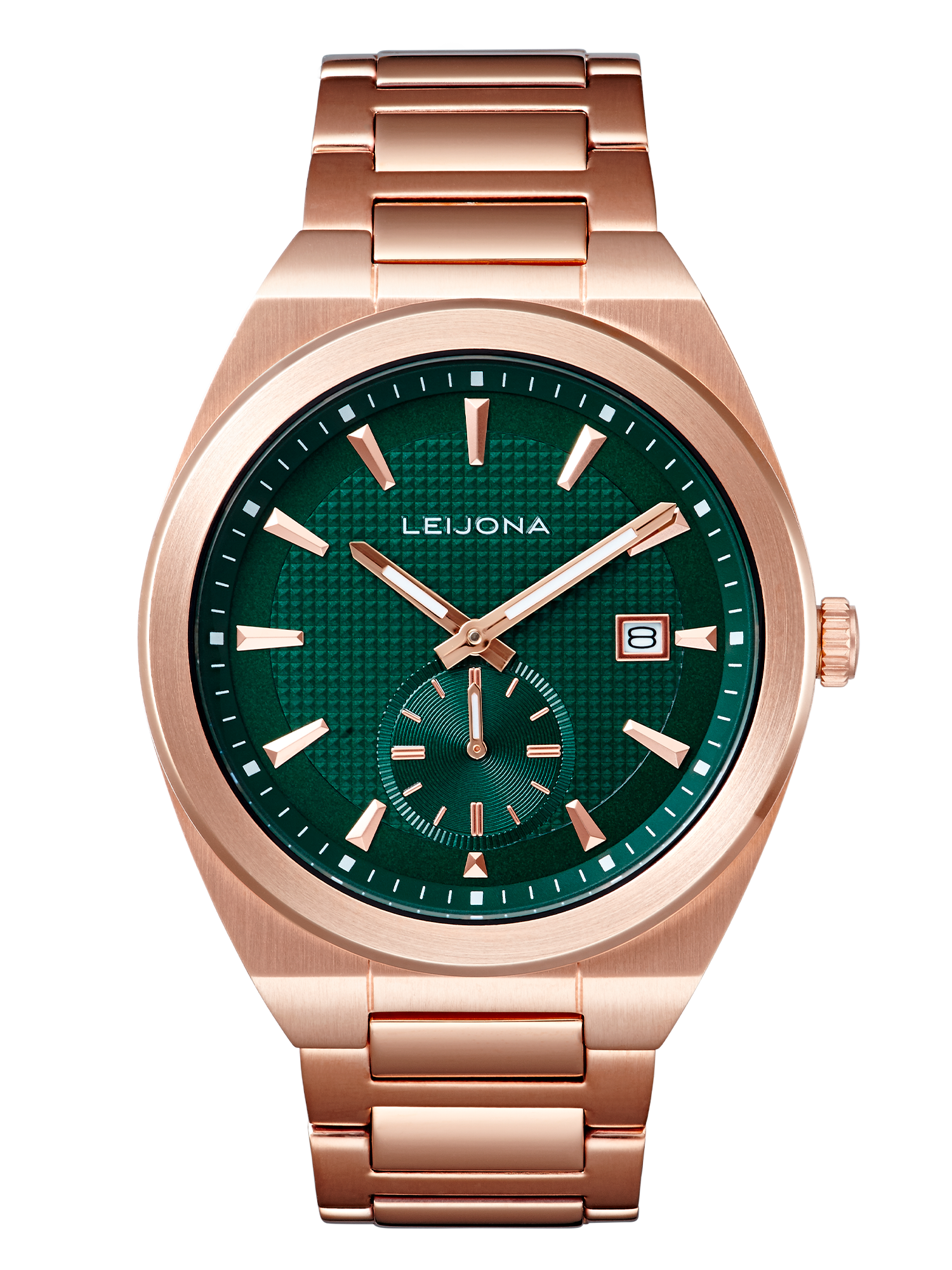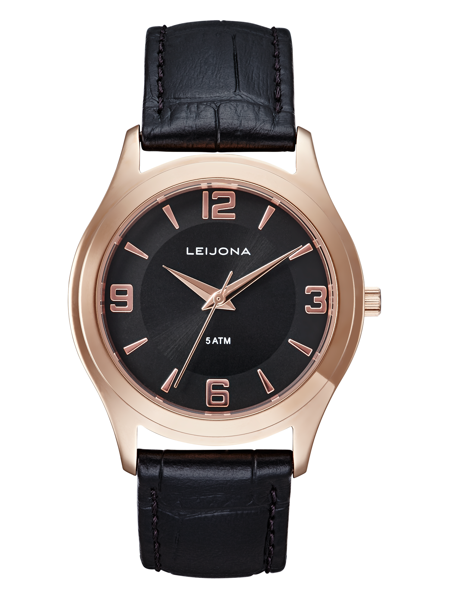 Reilu ja roteva kello ottaa tilansa ja istuu mukavan letkeästi ranteeseen. Jämerät yksityiskohdat rytmittävät kellotaulua ja ranneke jatkaa rungon salskeaa ilmettä. Kellotaulun tumma sävy yhdistettynä ruusukullan värisen teräksen hohtoon luo rauhallisen tasapainoisen kokonaisuuden.